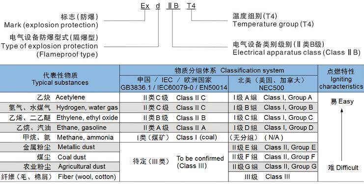 ExdIIBT4適用于II類B級(jí)(代表性物質(zhì):乙烯),溫度組別為T4及以下組的爆炸性氣體或粉末混合物存在的環(huán)境。